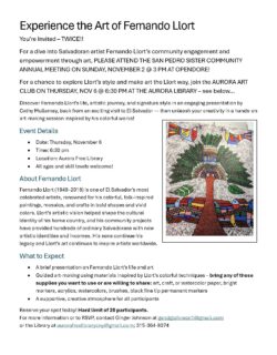 » Also, please attend the San Pedro Sister Community Annual Meeting on Sunday, November 2nd at 3 PM at Opendore, to learn more about Fernando Llort’s community engagement and empowerment through art!