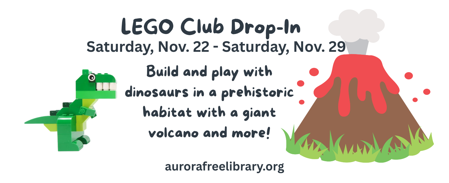 Lego Club—Drop-in DINO-vember Week Saturday, November 22 at 11:00 am Build and play with dinosaurs in a prehistoric habitat with a giant volcano and more! Drop in all week, from Saturday November 22 through Saturday, November 29th! All ages welcome.