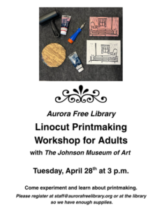 Please register at staff@aurorafreelibrary.org or at the library so we have enough supplies.