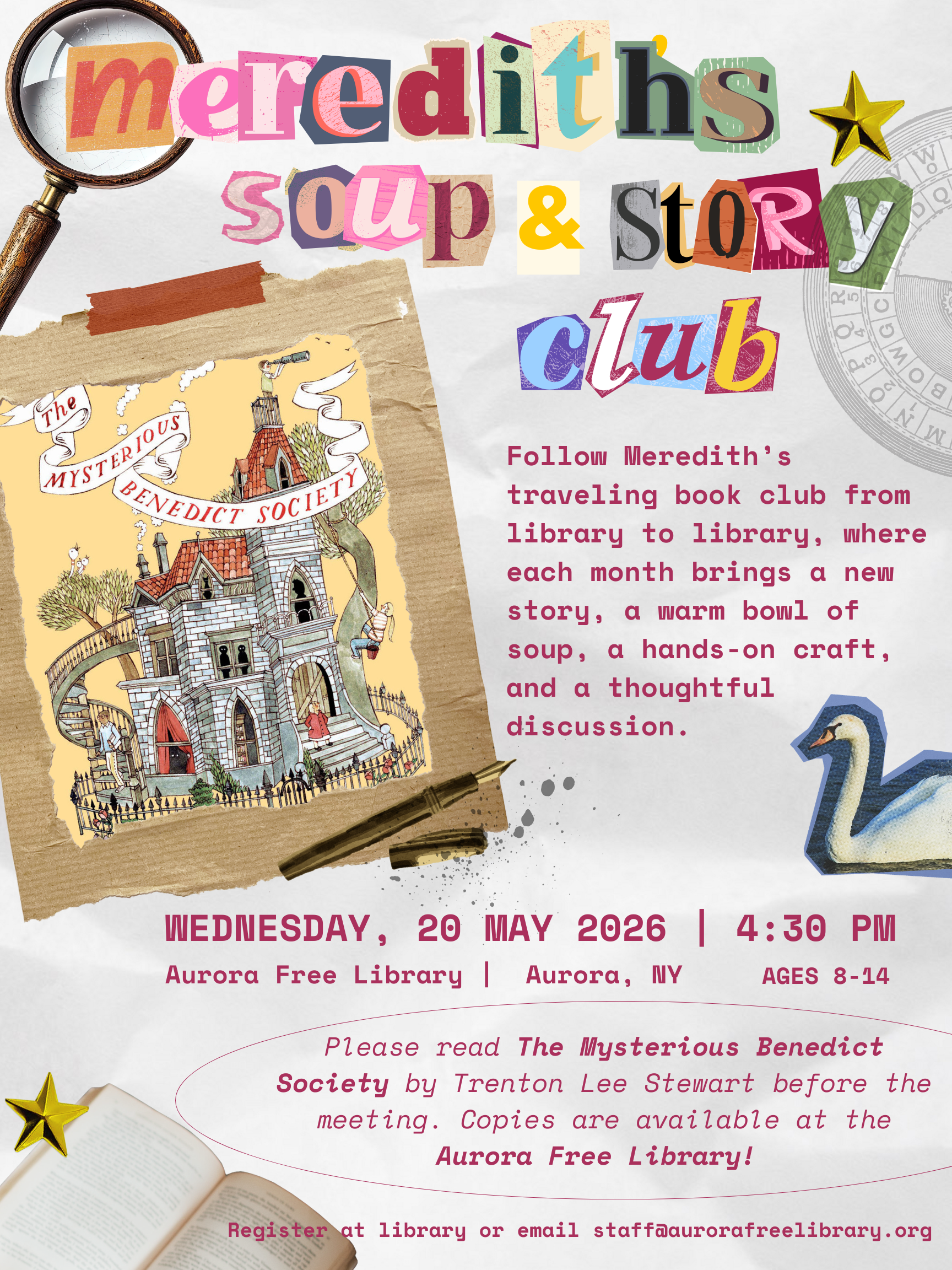 Follow Meredith’s traveling book club from library to library, where each month brings a new story, a warm bowl of soup, a hands-on craft, and a thoughtful discussion.