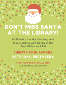 Santa at the Library! Saturday, December 6 at 4:00 pm Don’t miss Santa at the Library! He’ll visit after the Caroling and Tree Lighting with Santa at the Post Office at 4 PM. A FREE gift book for all kids!