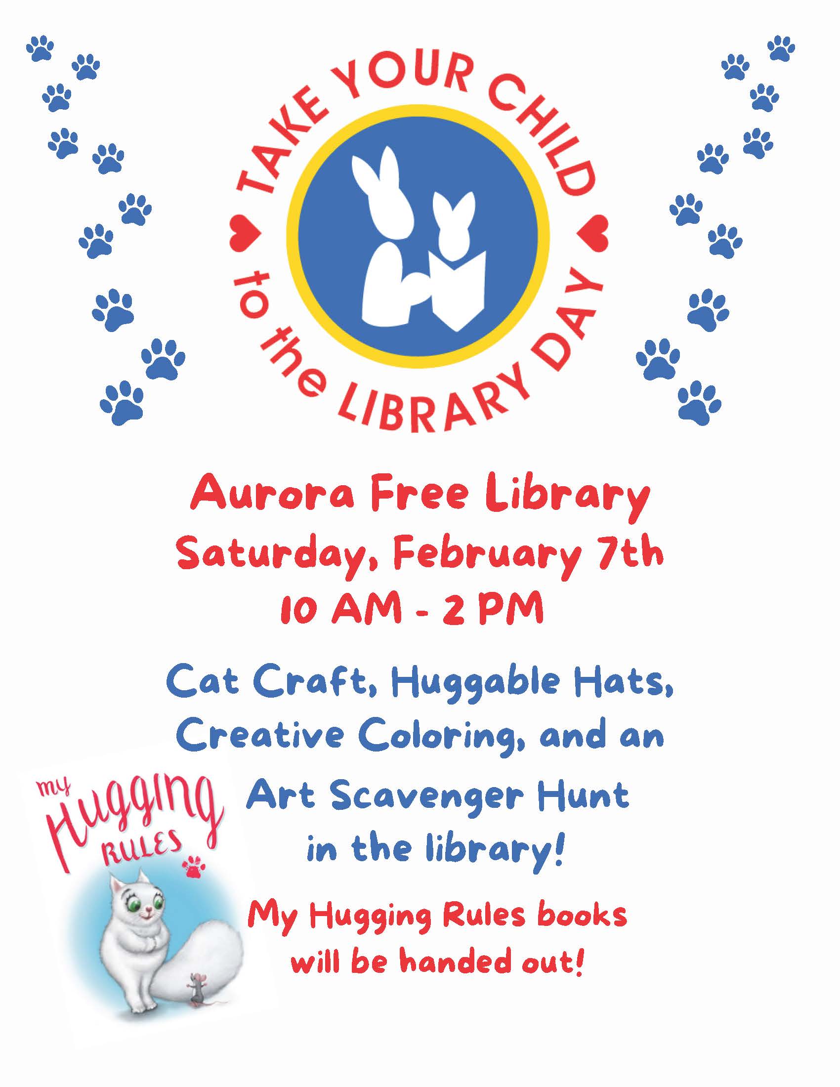Take Your Child to the Library Day Saturday, February 7 at 10:00 am Visit our library between 10 am — 2 pm for Take Your Child to the Library Day! Cat Craft, Huggable Hats, Creative Coloring, and an Art Scavenger Hunt in the libary! The book My Hugging Rules will be handed out—free!