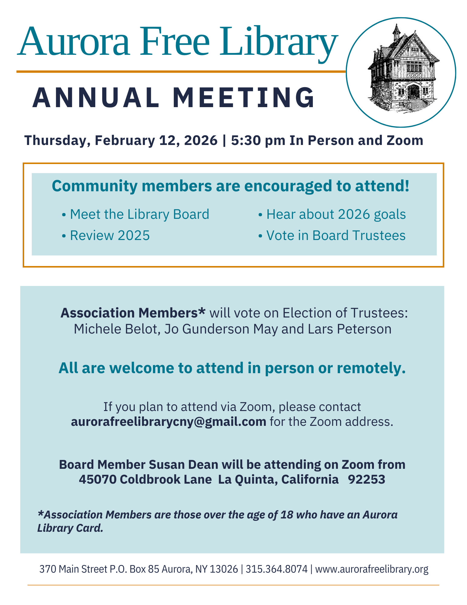 The Aurora Free Library Board of Trustees will meet for a brief business meeting immediately following the AFL Annual Meeting » on Thursday, February 12, 2026, at 5:30 PM at the Library.